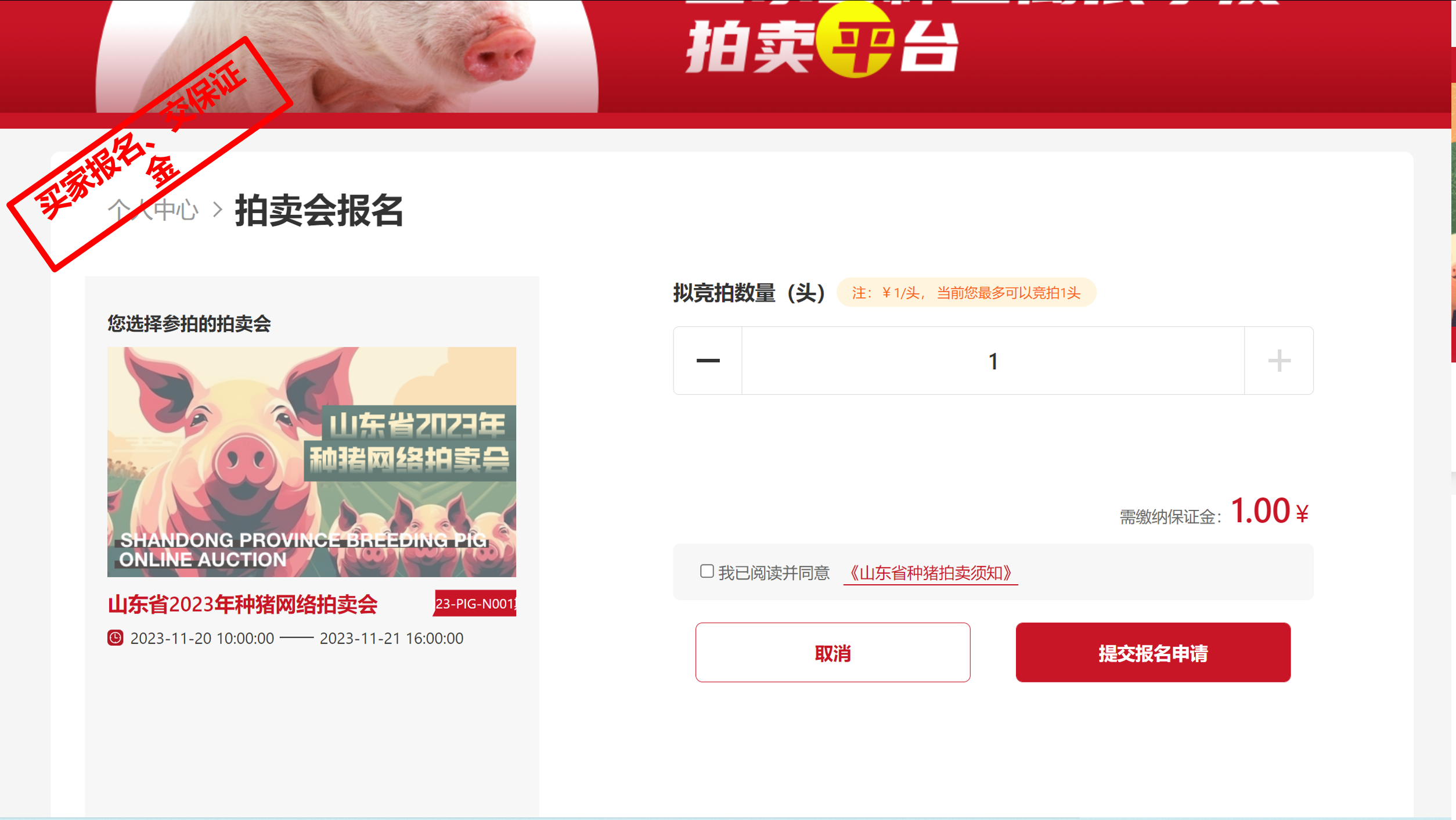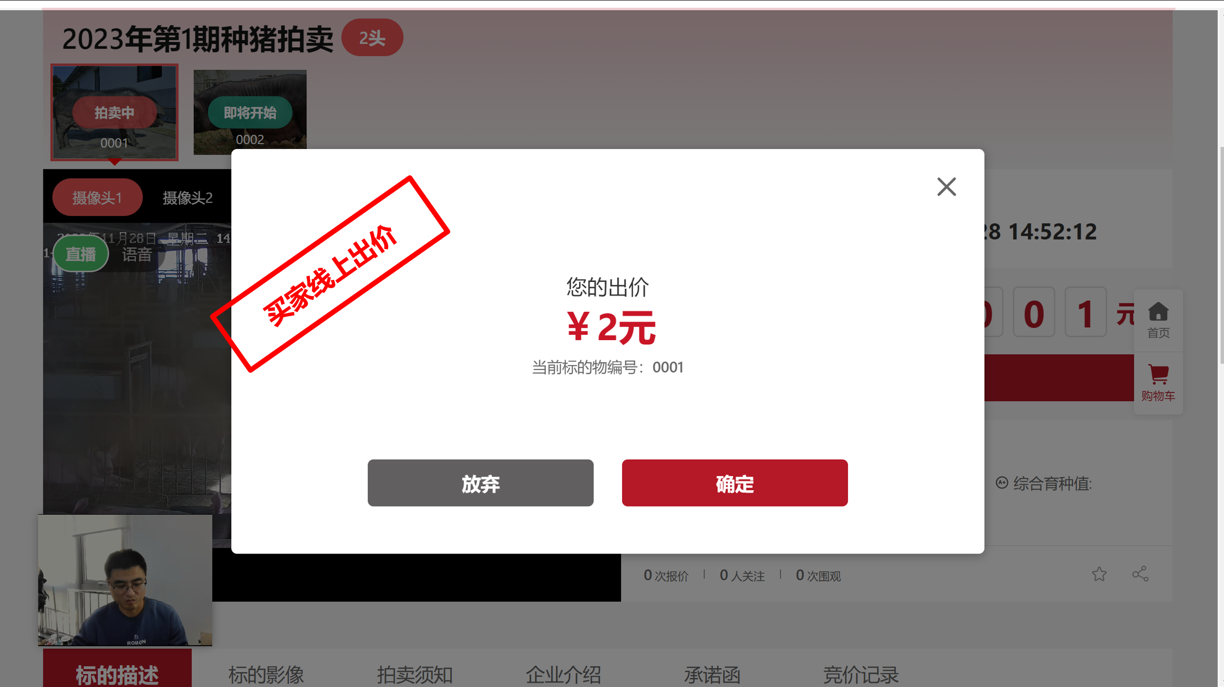 直播间视频同时显示拍卖师和猪舍的视频,视频上显示竞买人报价信息。在其他竞买人报价之后,可以点击“出价”按钮,自动按“加价幅度”加价。