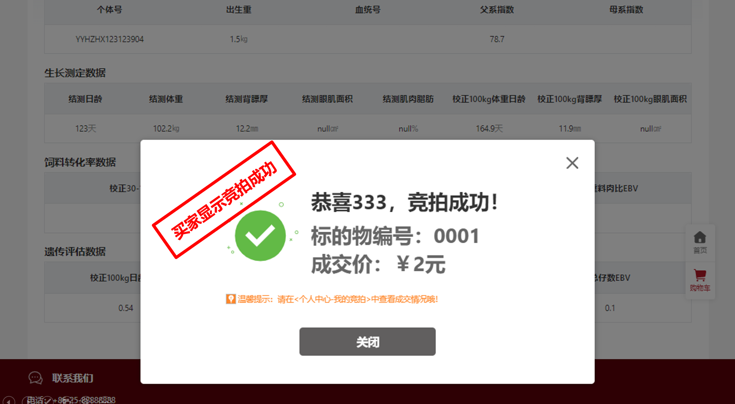 当竞拍人最后出价,拍卖师在线确定三次(信息在视频弹幕上显示),系统确定最后出价的竞买人中标,中标竞买人弹出确认消息,如下图: