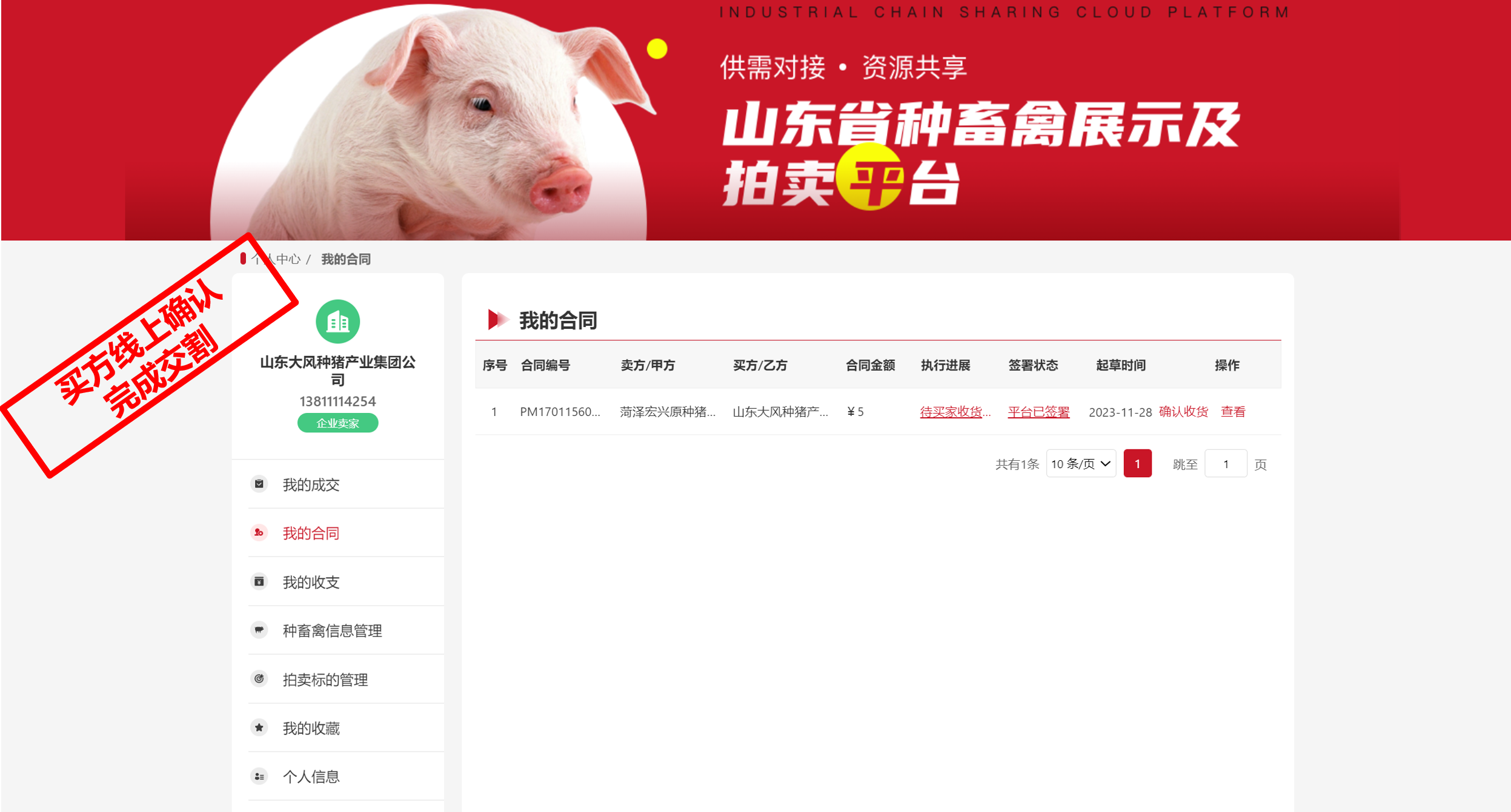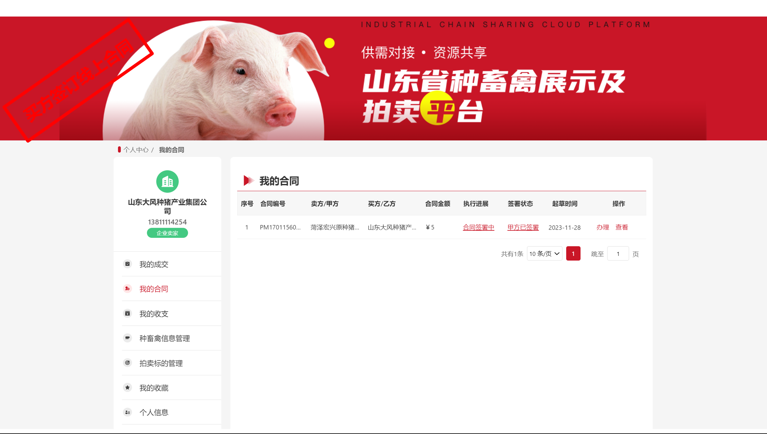 拍卖会接收后,系统根据成交结果,自动为中标竞买人生成格式化的电子合同,进入“个人中心>>我的合同”,如下图: