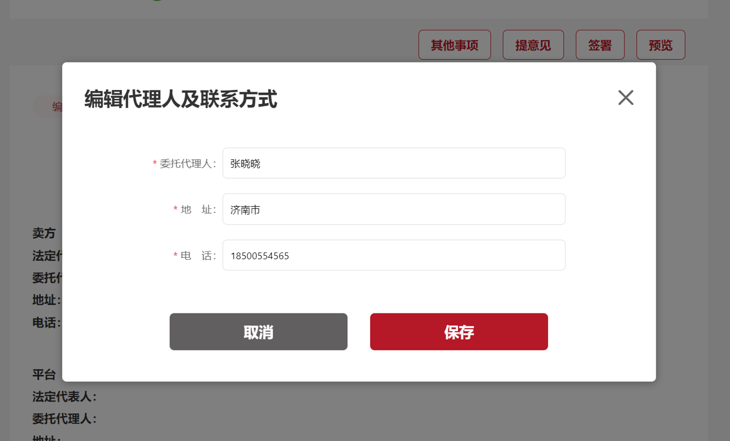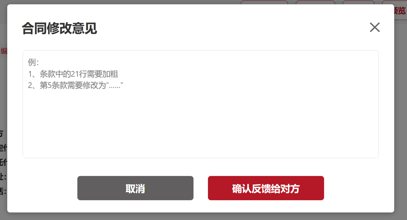 2、可以点击“提意见”按钮,针对合同条款提出意见和建议,买卖双方在电子合同里都可以看到。