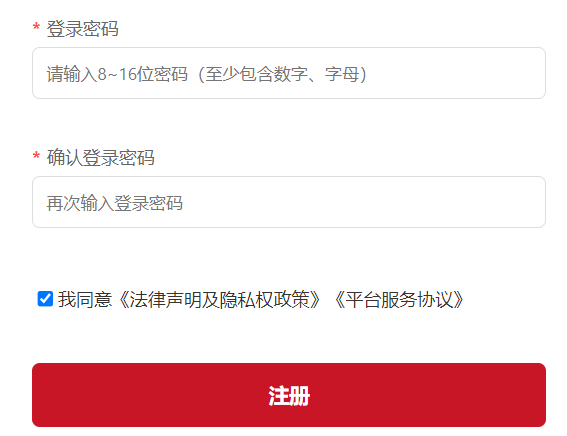 再输入账号密码、重复输入密码,勾选“我同意《法律声明及隐私权政策》《平台服务协议》”,点击“注册”按钮,完成用户账号注册。如下图: