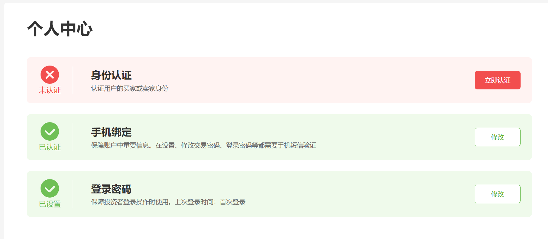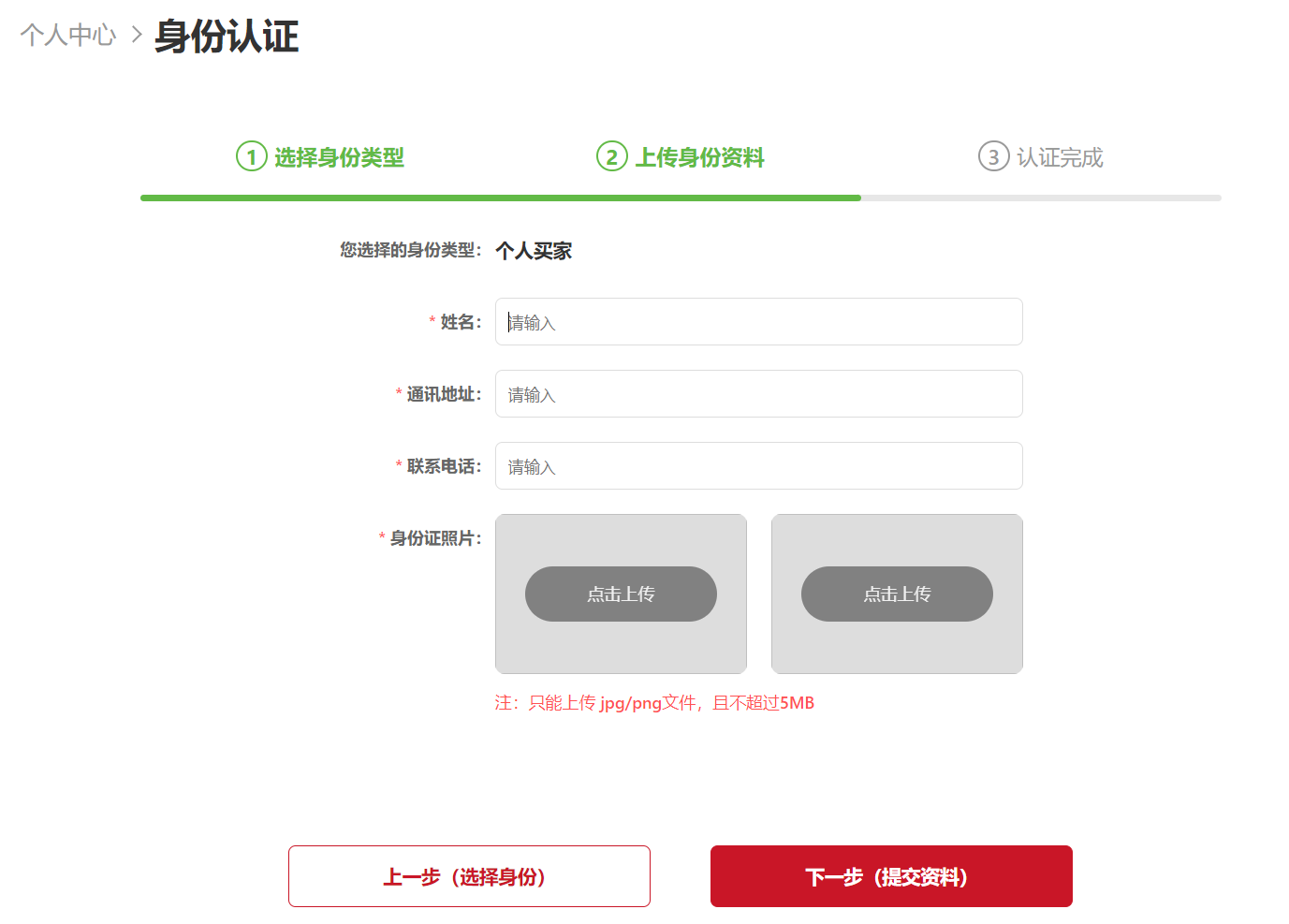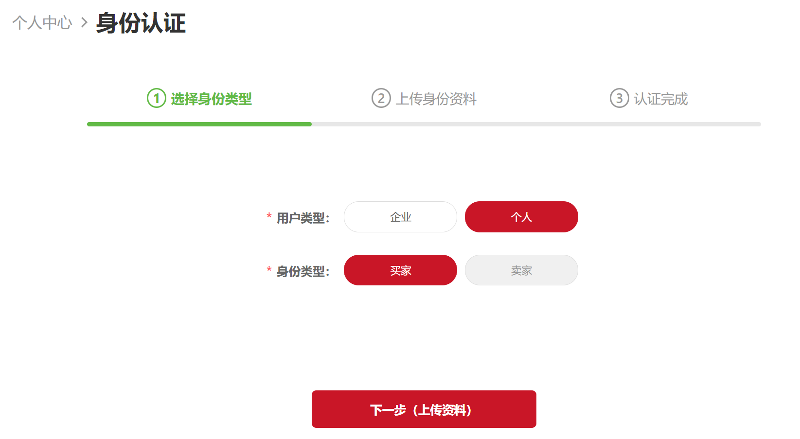 用户类型选择“个人”,身份类型默认选择“买家”,点击“下一步”按钮,开始个人身份认证,个人实名认证需要上传个人身份证正反面,如下图: