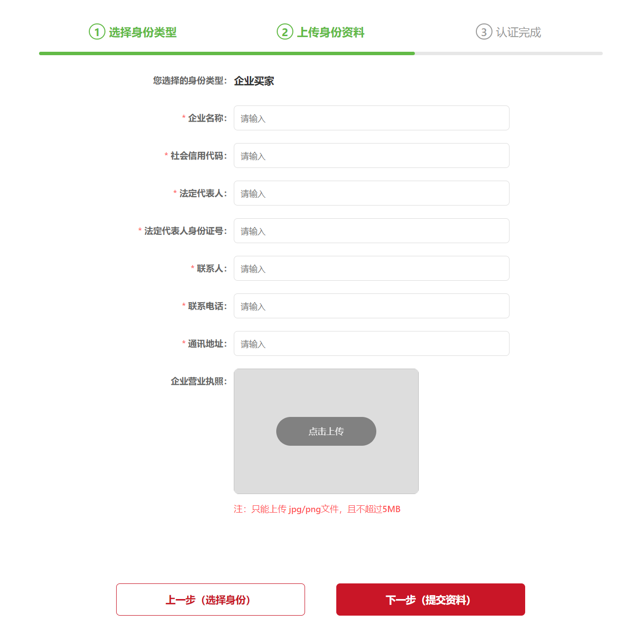 用户类型选择“企业”,身份类型选择“买家”,点击“下一步”按钮,开始企业认证,需要填写企业身份四要素: